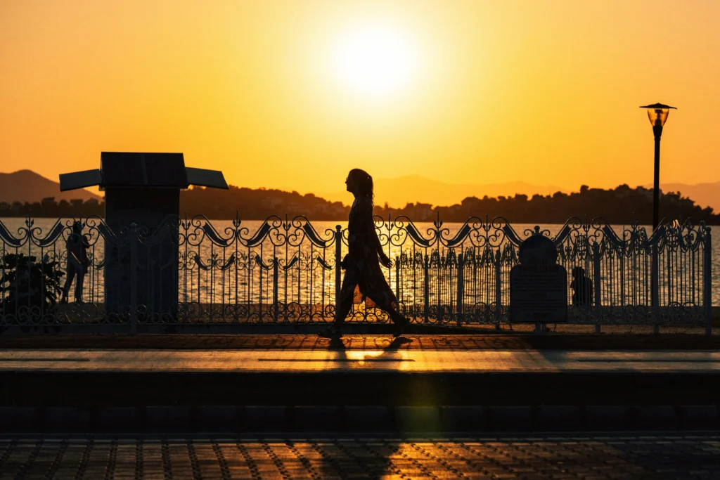 Fethiye şehir merkezinde, günbatımında yürüyüş yapan bir kadın.
